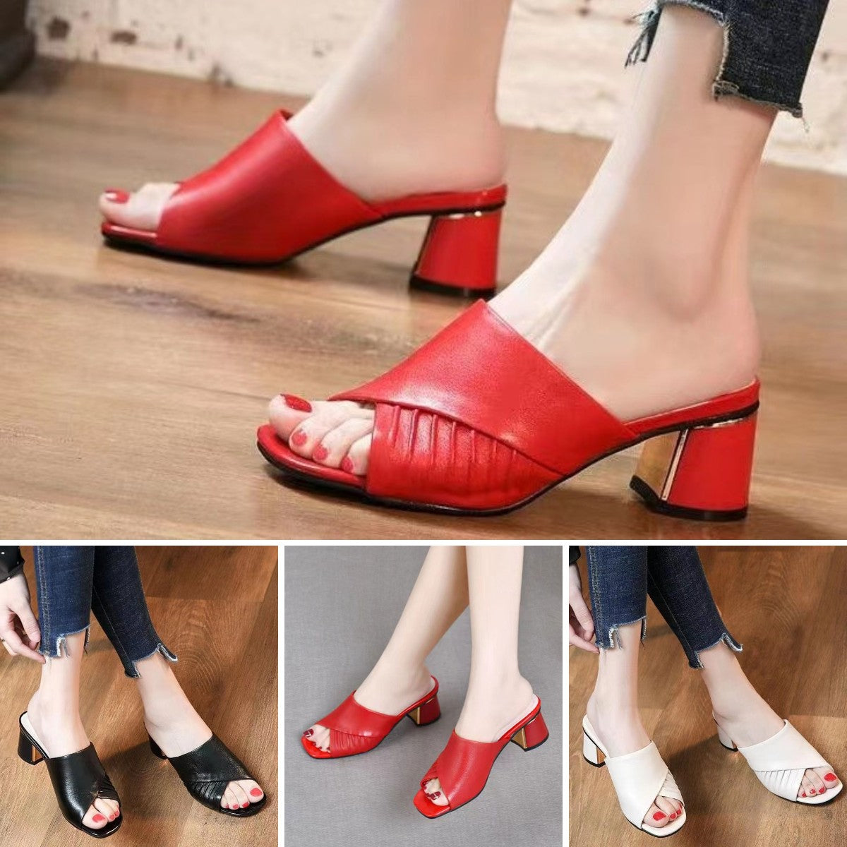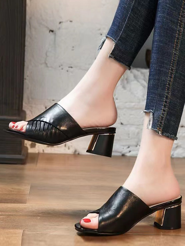 【35-42】2025-ös új divatos, vastag sarkú puha bőr nyári papucsok