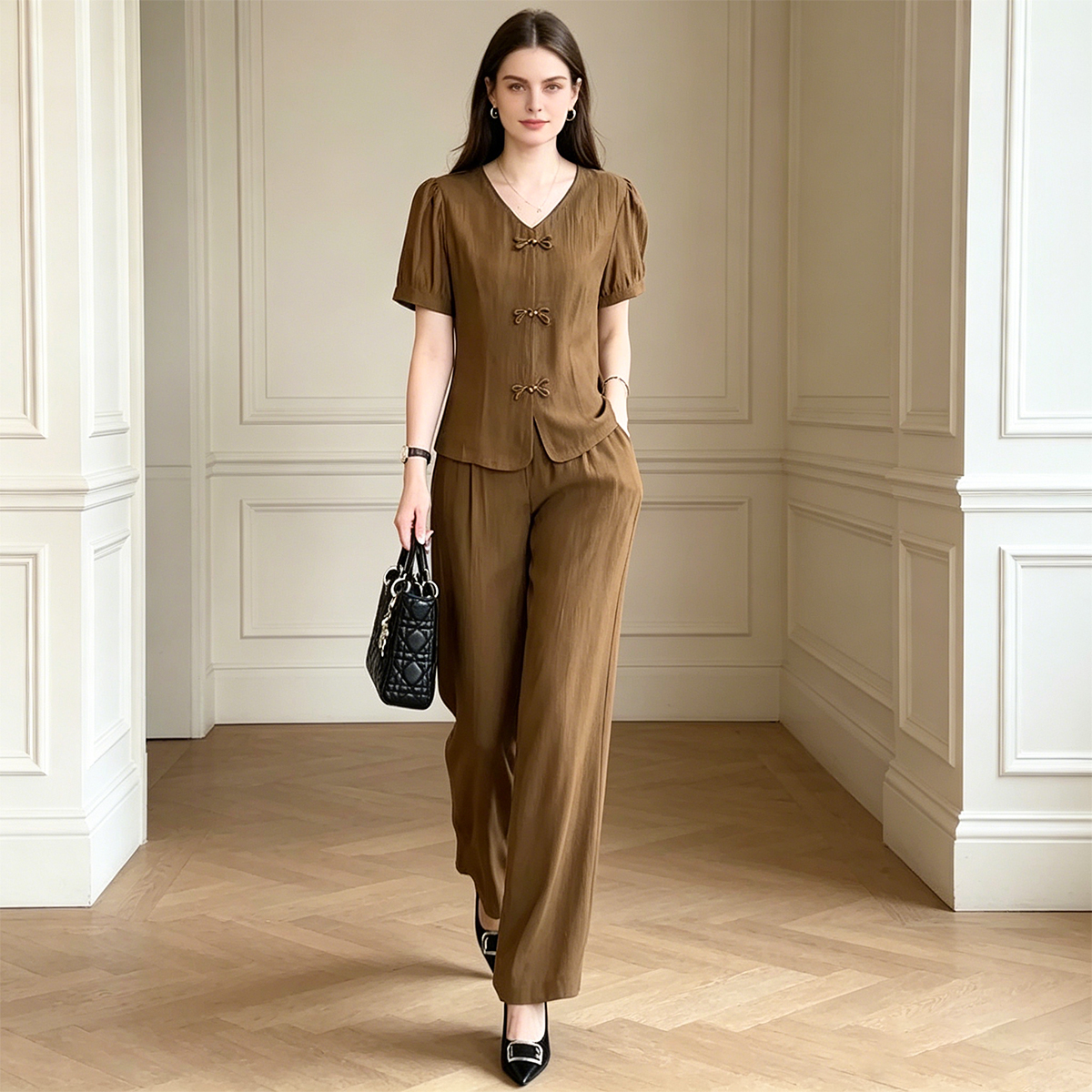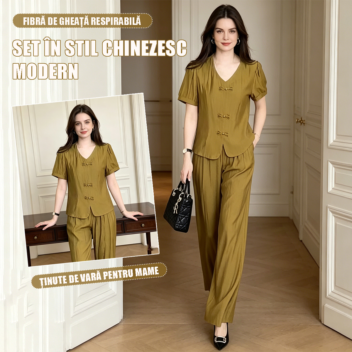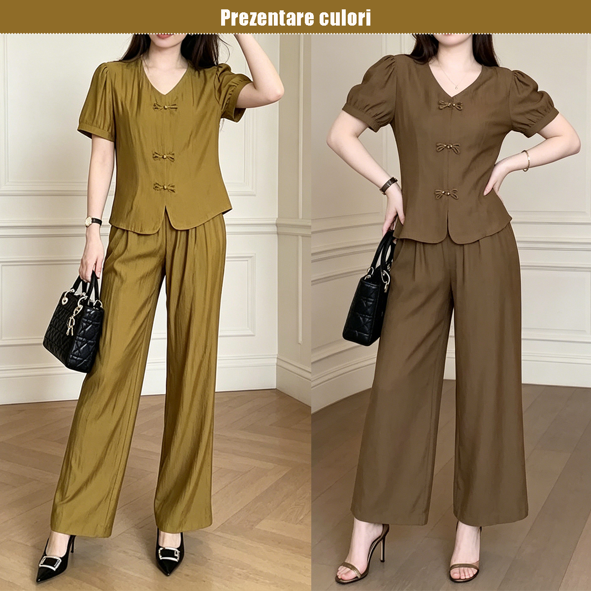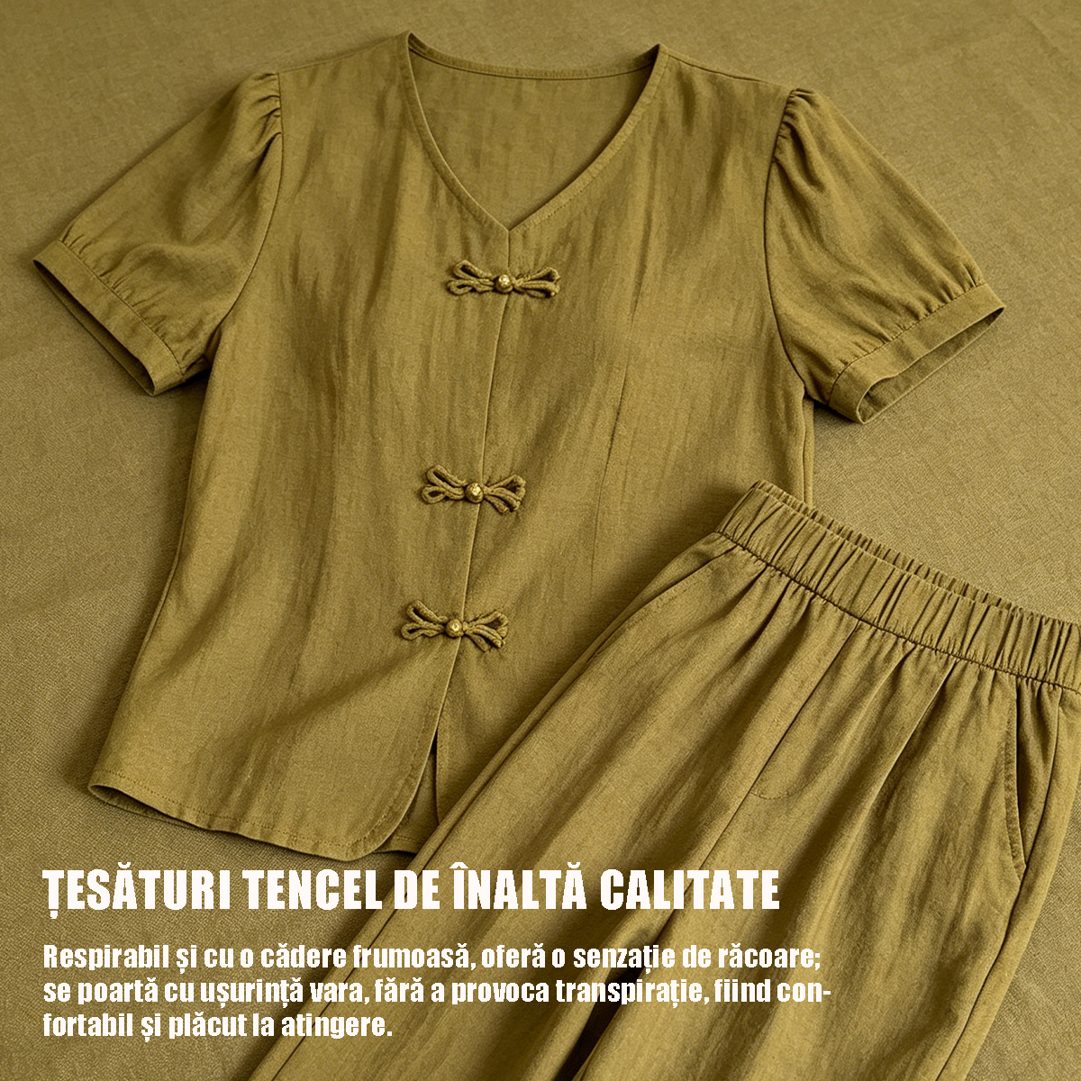Set Elegant Stil Nou Chinezesc: Top cu Nasturi Tradiționali și Pantaloni Largi cu Talie Înaltă, Compleu de Lux din Două Piese