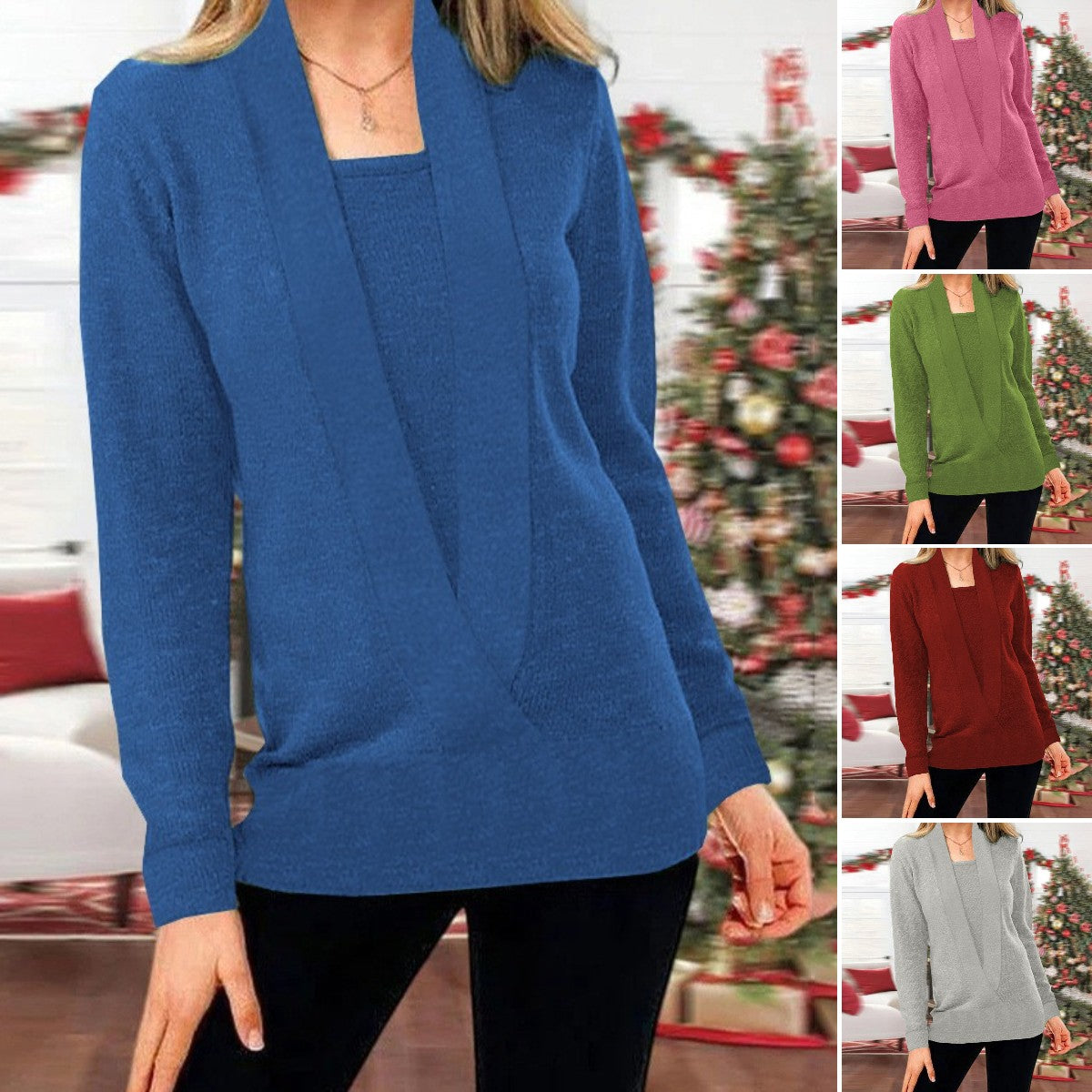 Egyszínű kötött pulóver, ál-kétrétegű dizájn – beépített top hatású belső résszel