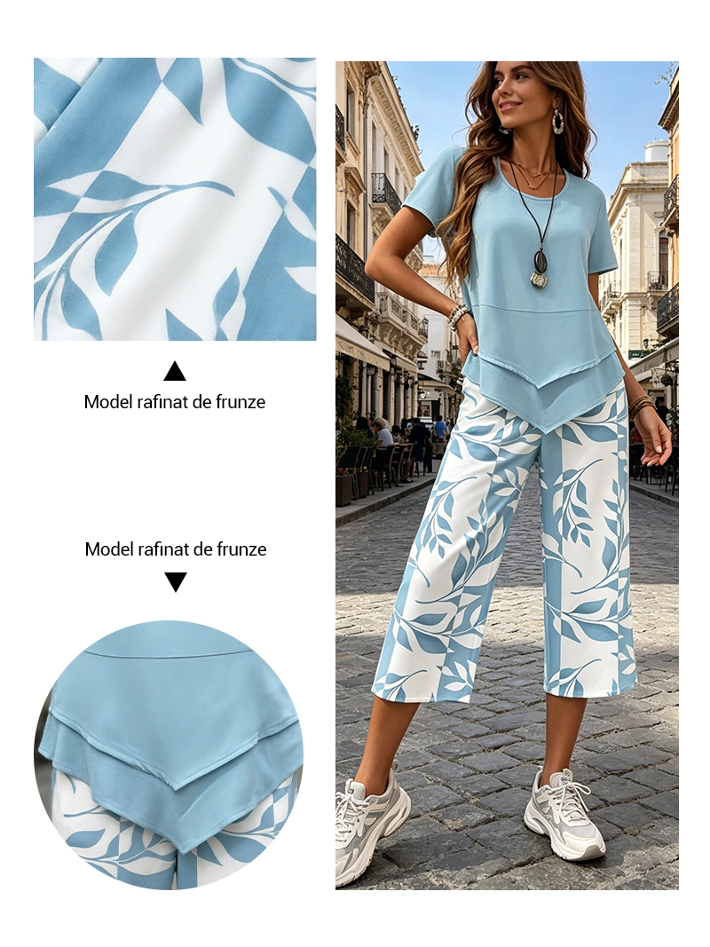Set Elegant de Damă din Două Piese: Top cu Croi Asimetric și Pantaloni Imprimați – Ținută Office și Casual Perfectă
